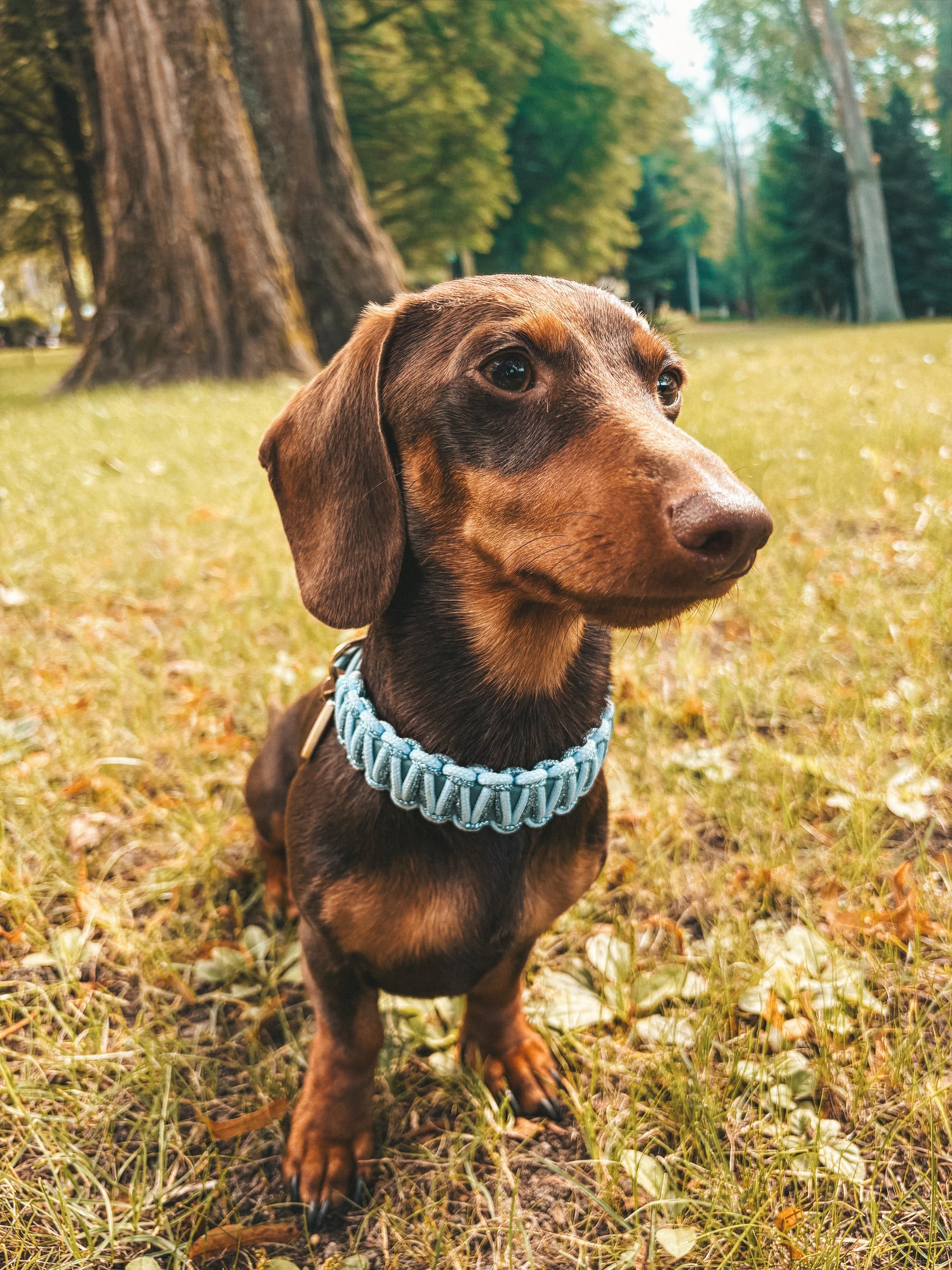 Hier seht ihr Fiete mit einem Halsband aus Biothane in Taubenblau und einer Paracordumwickelung in Polarblau kombiniert mit Glitzerblau.